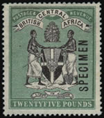 , Nyasaland 1919 MCA £10 purple and royal blue, large part original gum; fine and fresh. S.G. 99e, £4,500. (Lot 266).