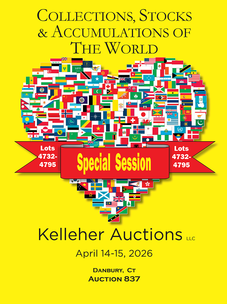 Nearly 800 lots from around the globe, offering dealers and collectors alike a bonanza of fresh material. US begins with well-filled collections of quality material, followed by numerous issue-specific holdings, strong Dealer's Stocks, and massive amounts of Face Value lots, along with Possessions and Postal History compilations. British Commonwealth runs Australia to Zanzibar, plus Commonwealth-wide and area collections, while British North America offers a wealth of Canada and Provinces. Worldwide spans Afghanistan to Vietnam, with general collections, regional holdings, strong Accumulations and Dealer's Stocks, as well as fun Topical collections following.