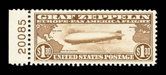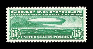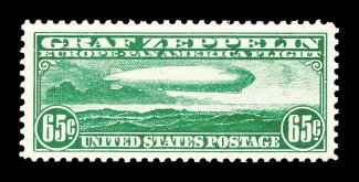 1031 og C13 image#C13, 65c Graf Zeppelin, exceptionally well centered within large margins, strong rich color, o.g., barest trace of hinging (if any), extremely fine. (Image) $240.00